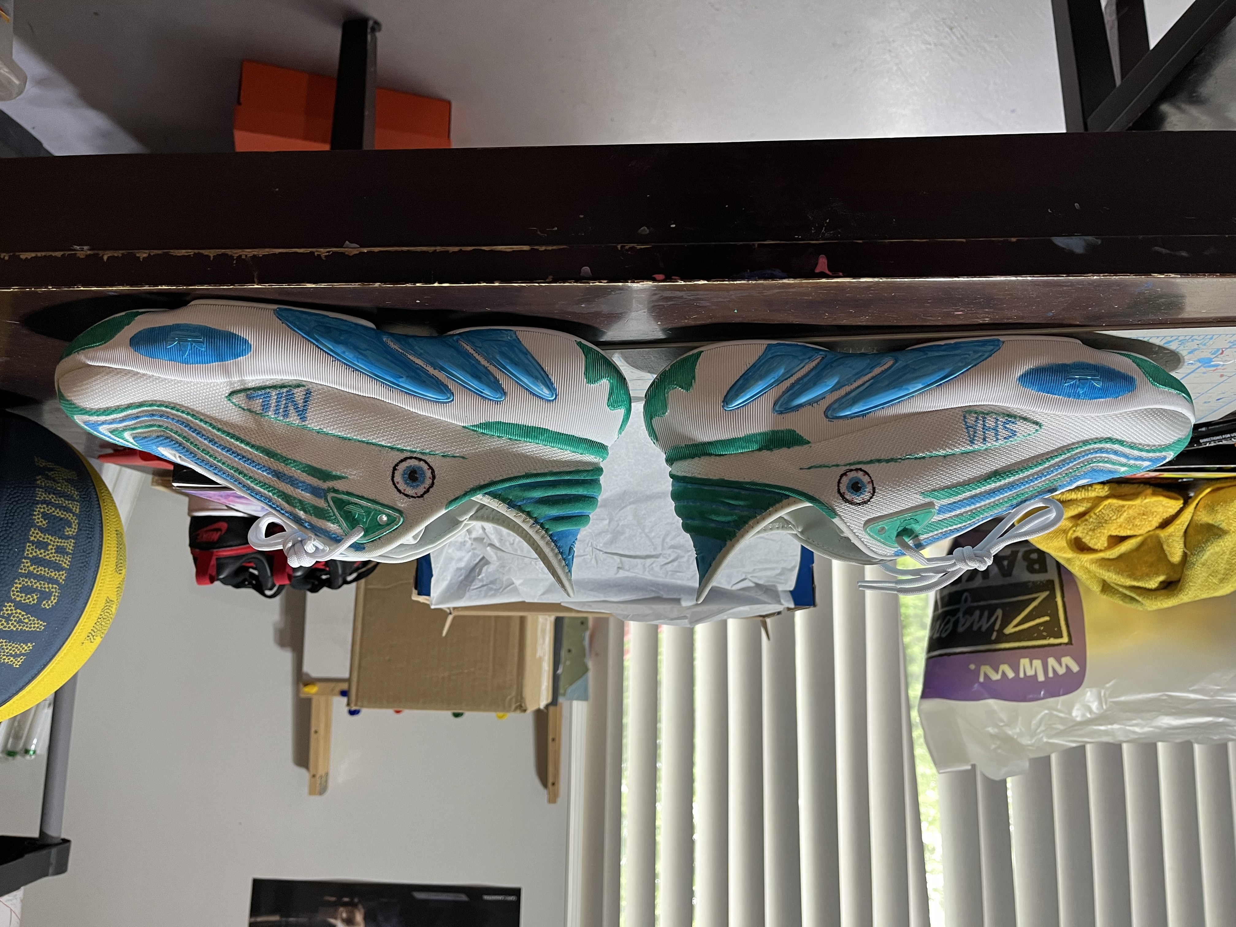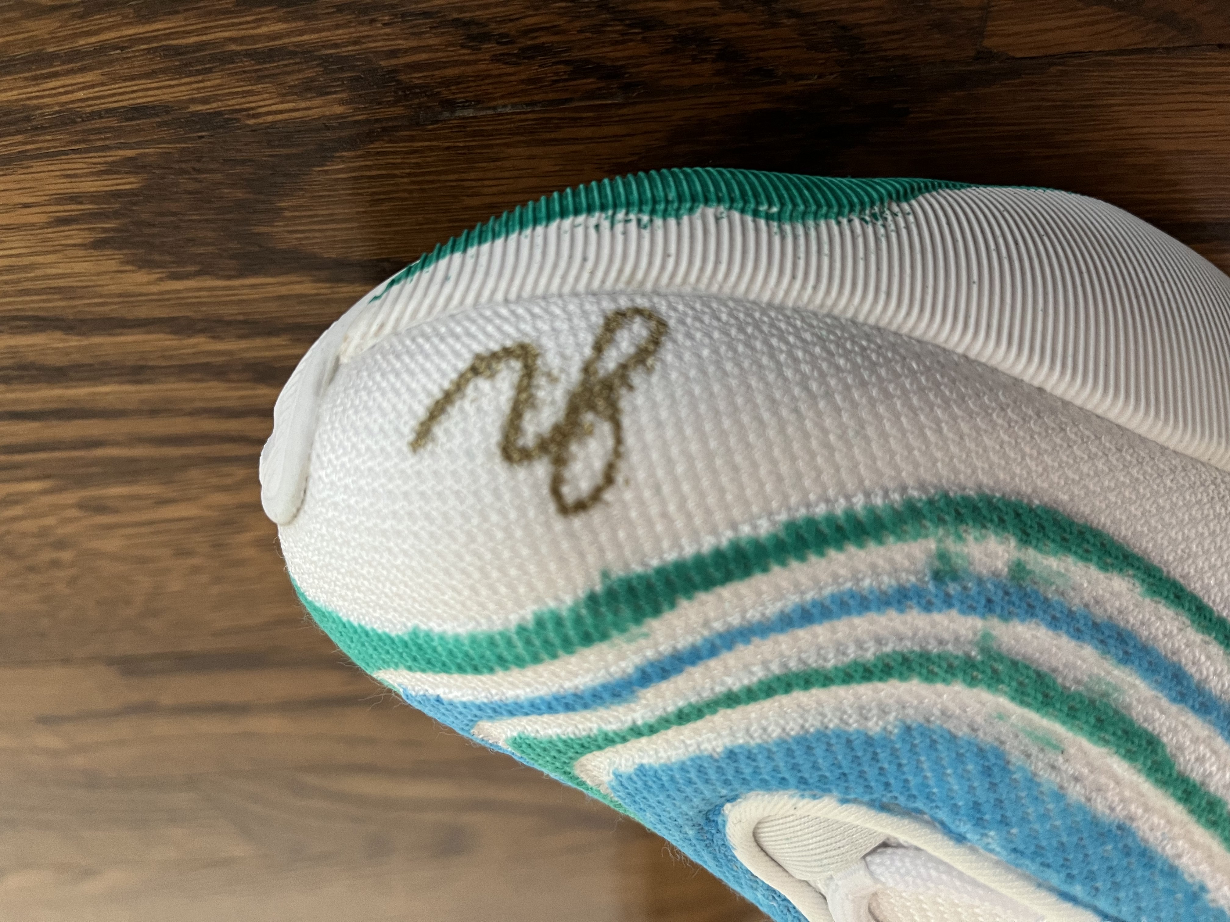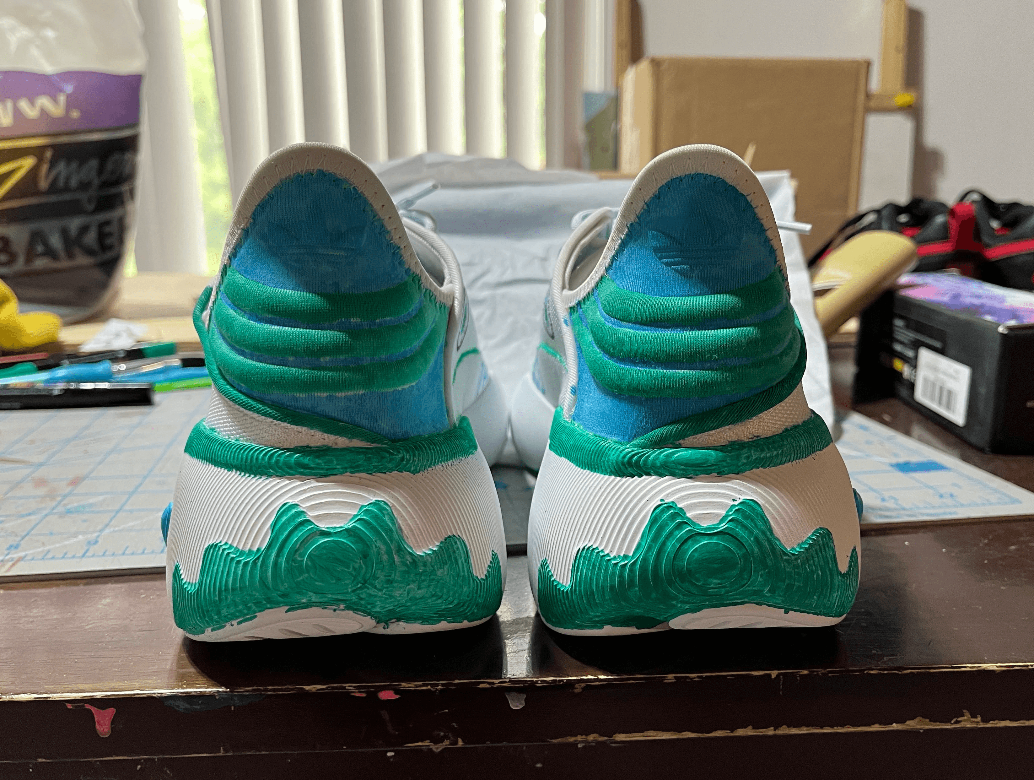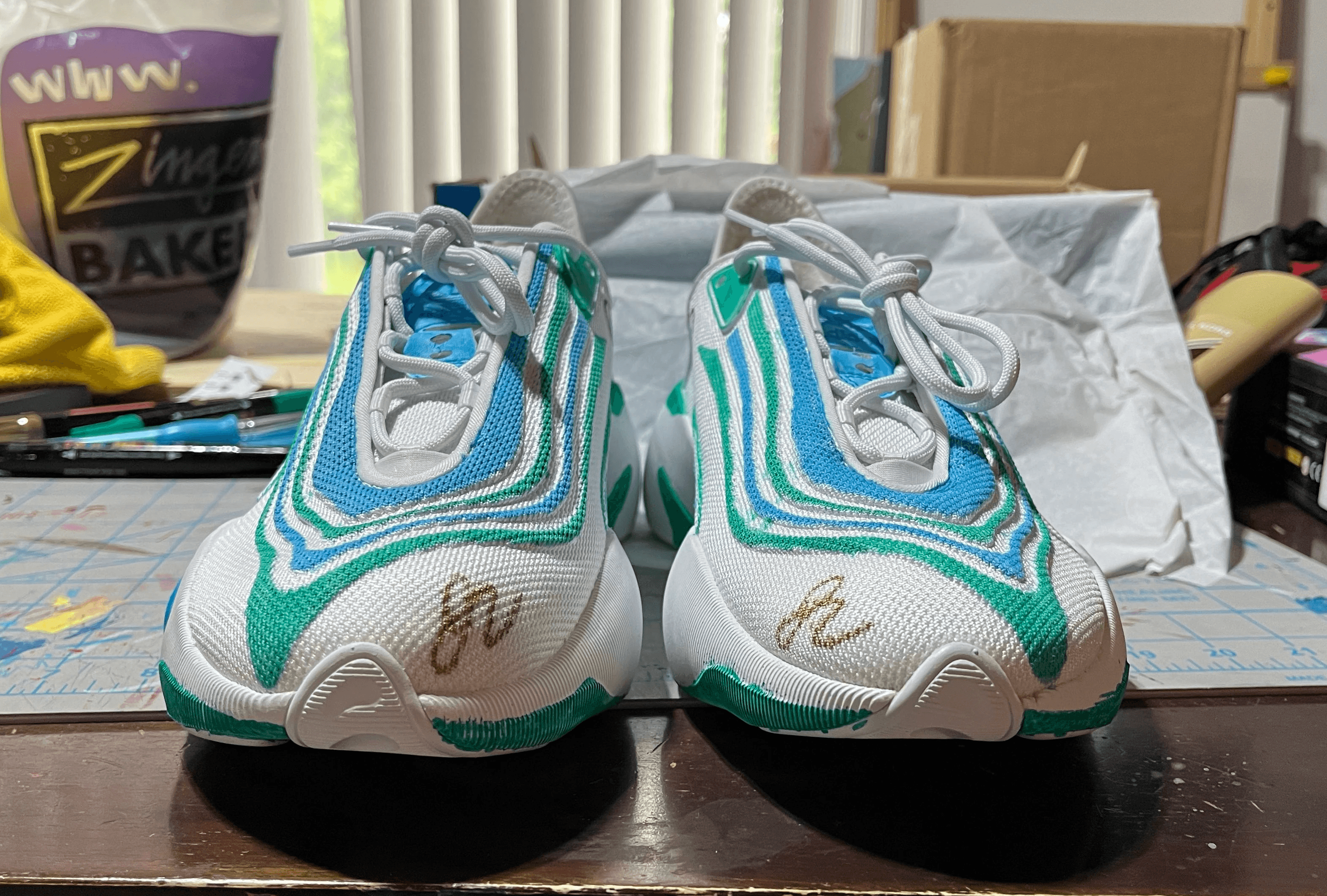 These custom sneakers feature a vibrant, hand-drawn design with flowing teal, blue, and green patterns over a white base. Accents like the "S-H-A" initials and a gold signature on the toe add a personal touch to the artistic style.