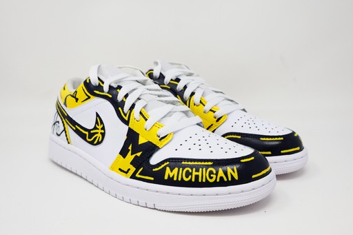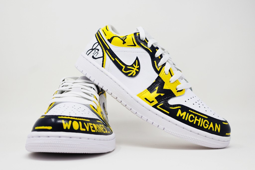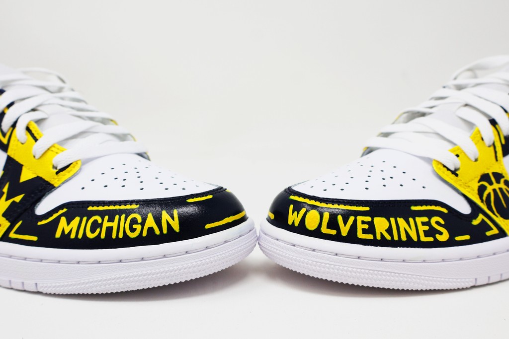 These custom sneakers highlight a Michigan basketball theme with bold maize and navy artwork. Hand-painted details including basketball graphics, net designs, and dynamic basketball lines on the swishes give the shoes an energetic, court-inspired feel. The overall look blends team spirit with a unique, illustrated style that makes them stand out as true Michigan hoops customs.