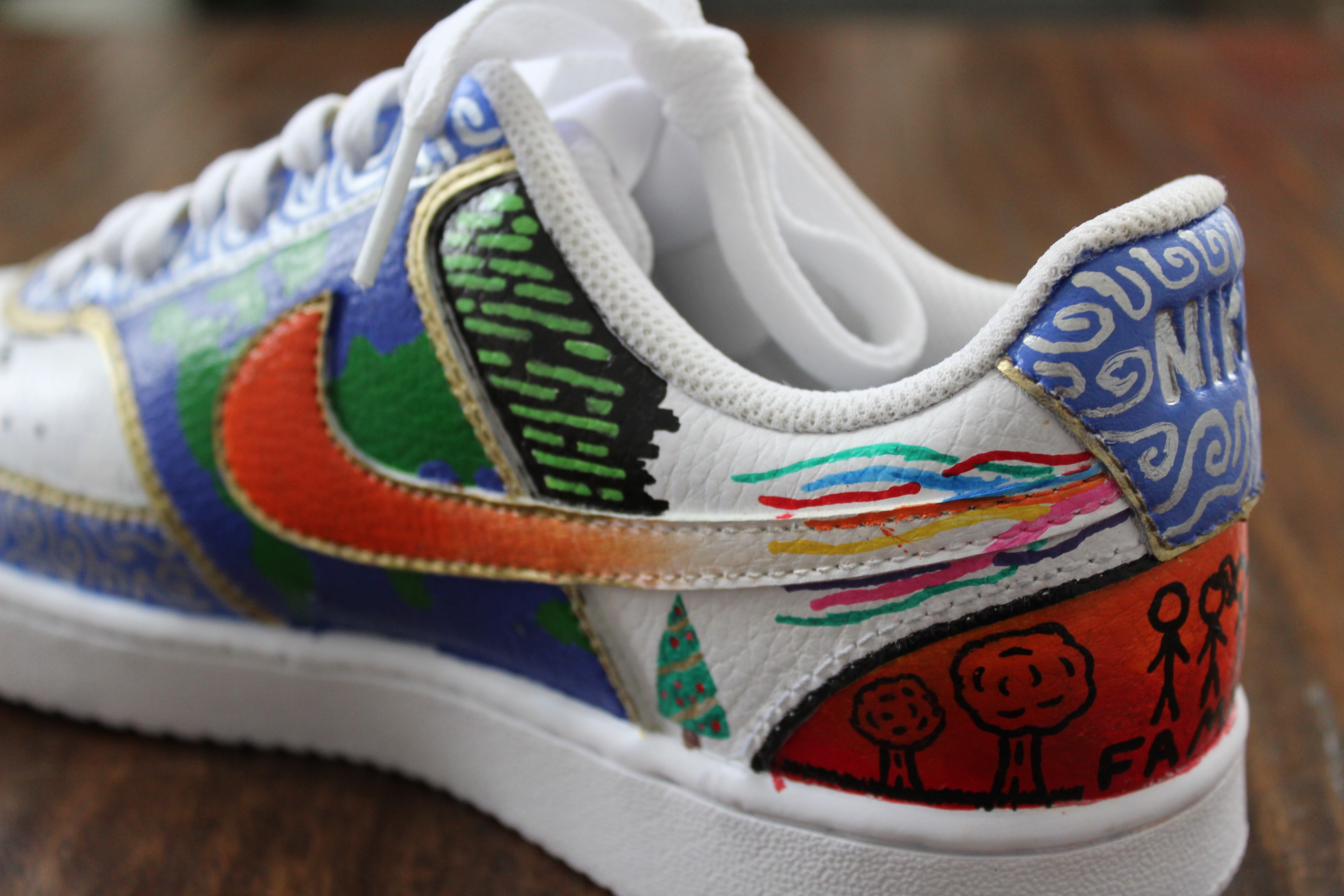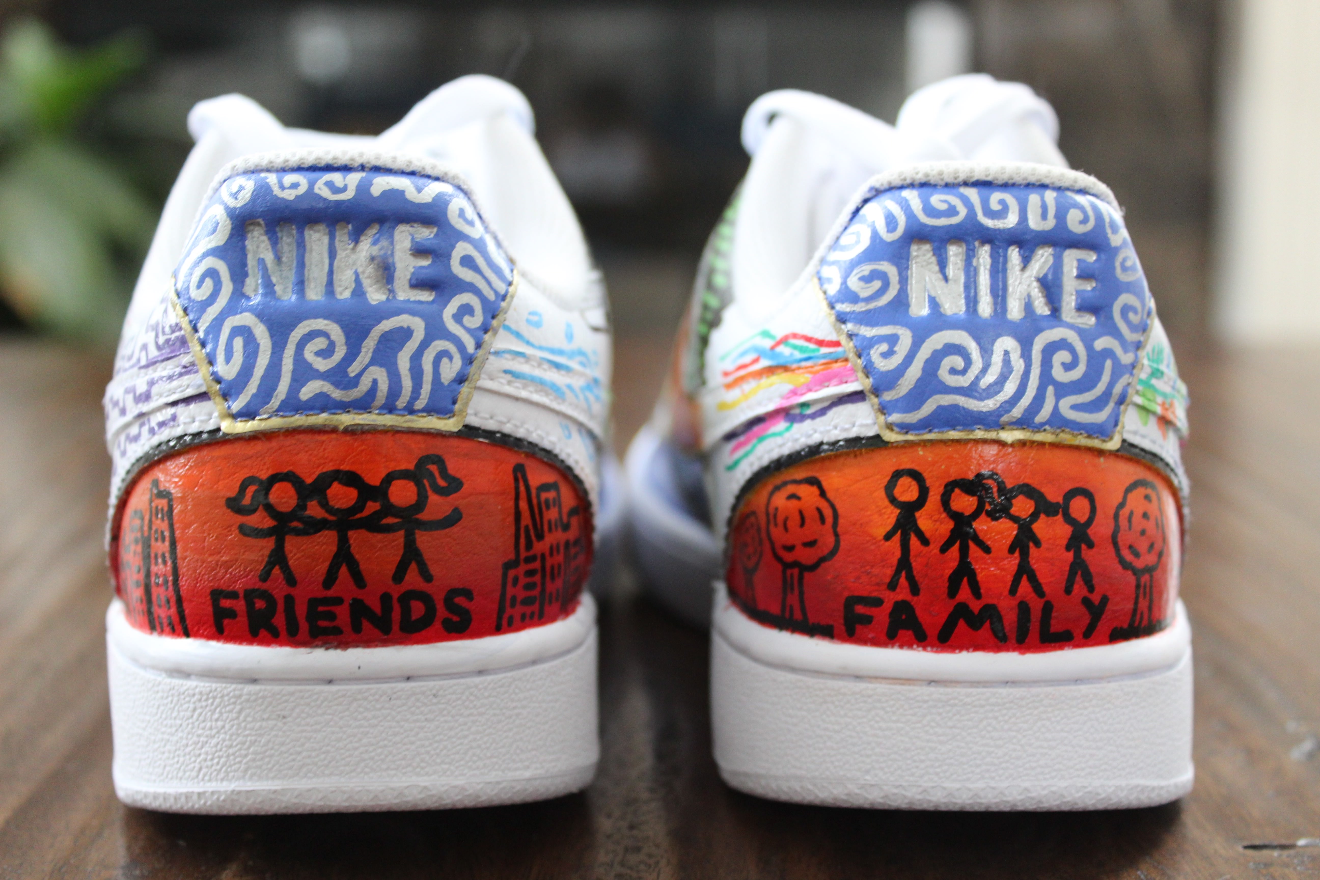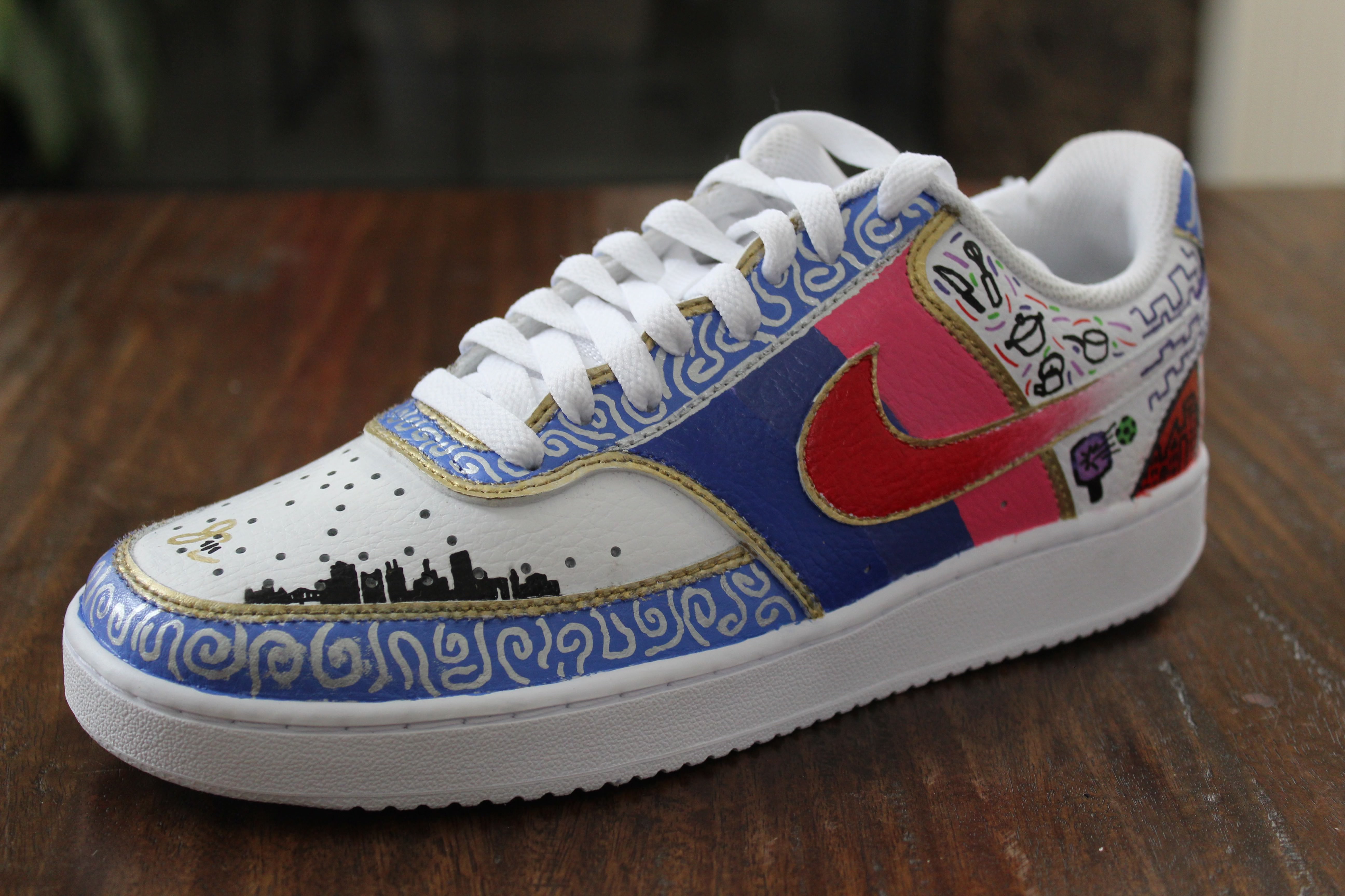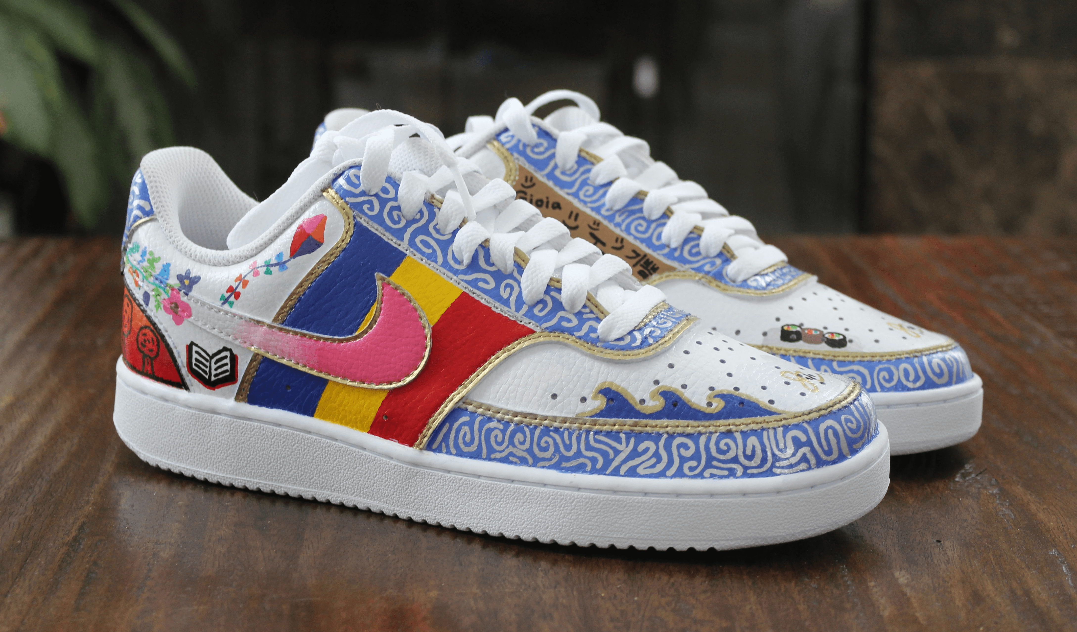 These custom Nike sneakers feature a vibrant and eclectic design with colorful panels, intricate blue and silver swirling patterns, and playful hand-drawn illustrations including sushi, kites, and flowers. The mix of cultural motifs and bold colors gives the shoes a unique, artistic personality that stands out.