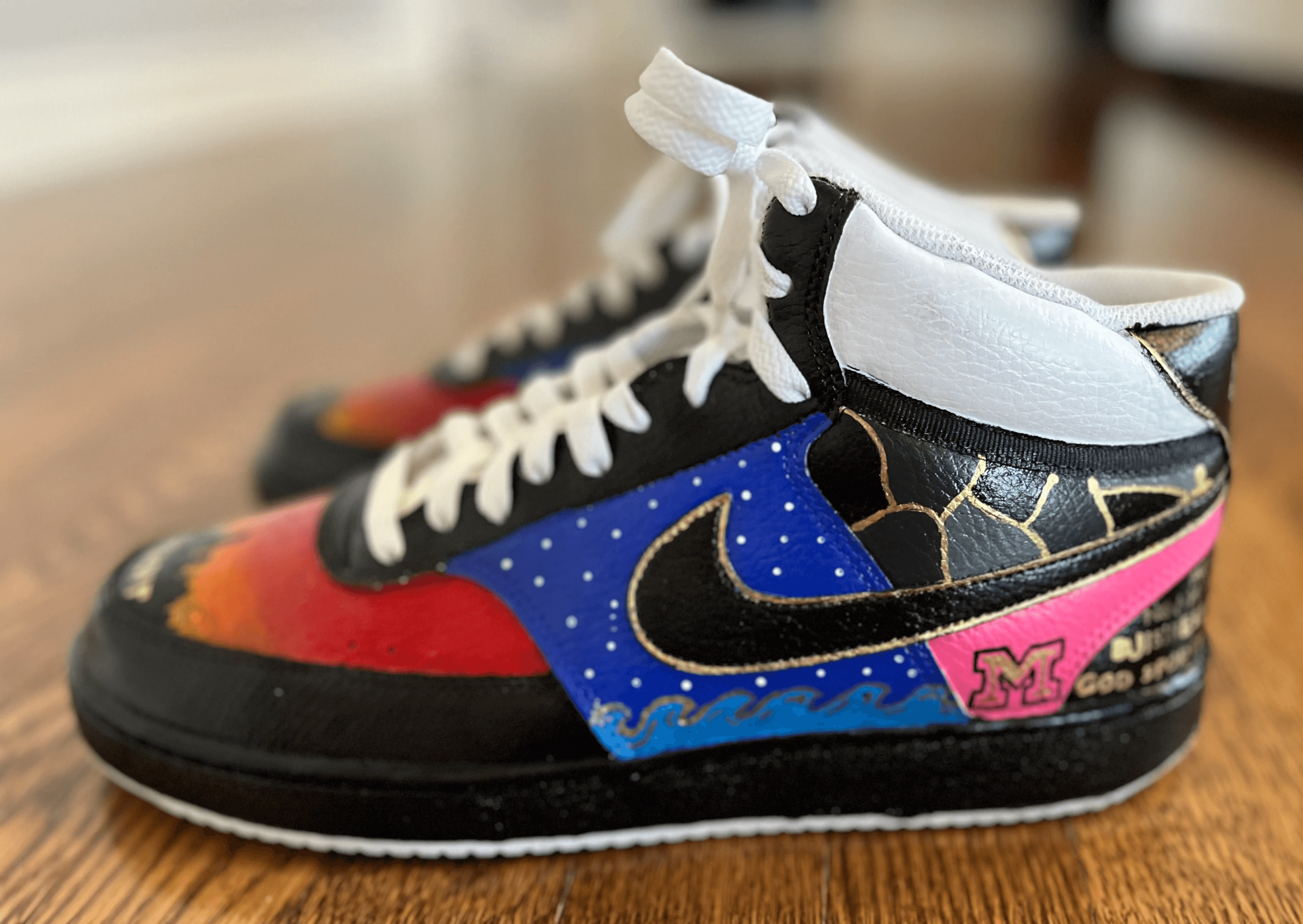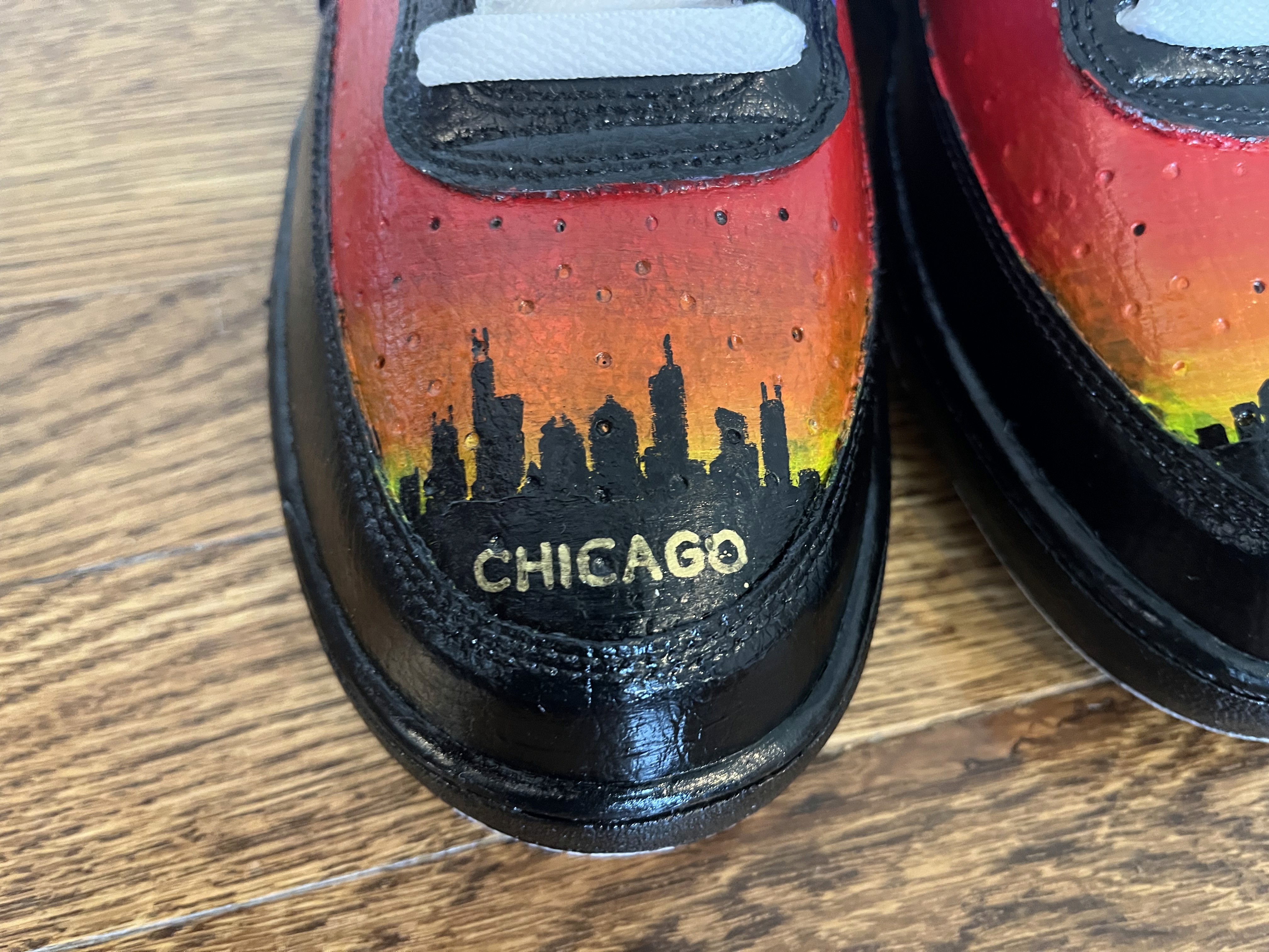 These custom Nike sneakers feature a vibrant, hand-painted design showcasing city skylines of Detroit and Chicago, bold colors, and intricate patterns, including ocean waves and gold trimmed swooshes. The shoes combine artistic flair with urban culture, making them a unique and expressive fashion statement.
