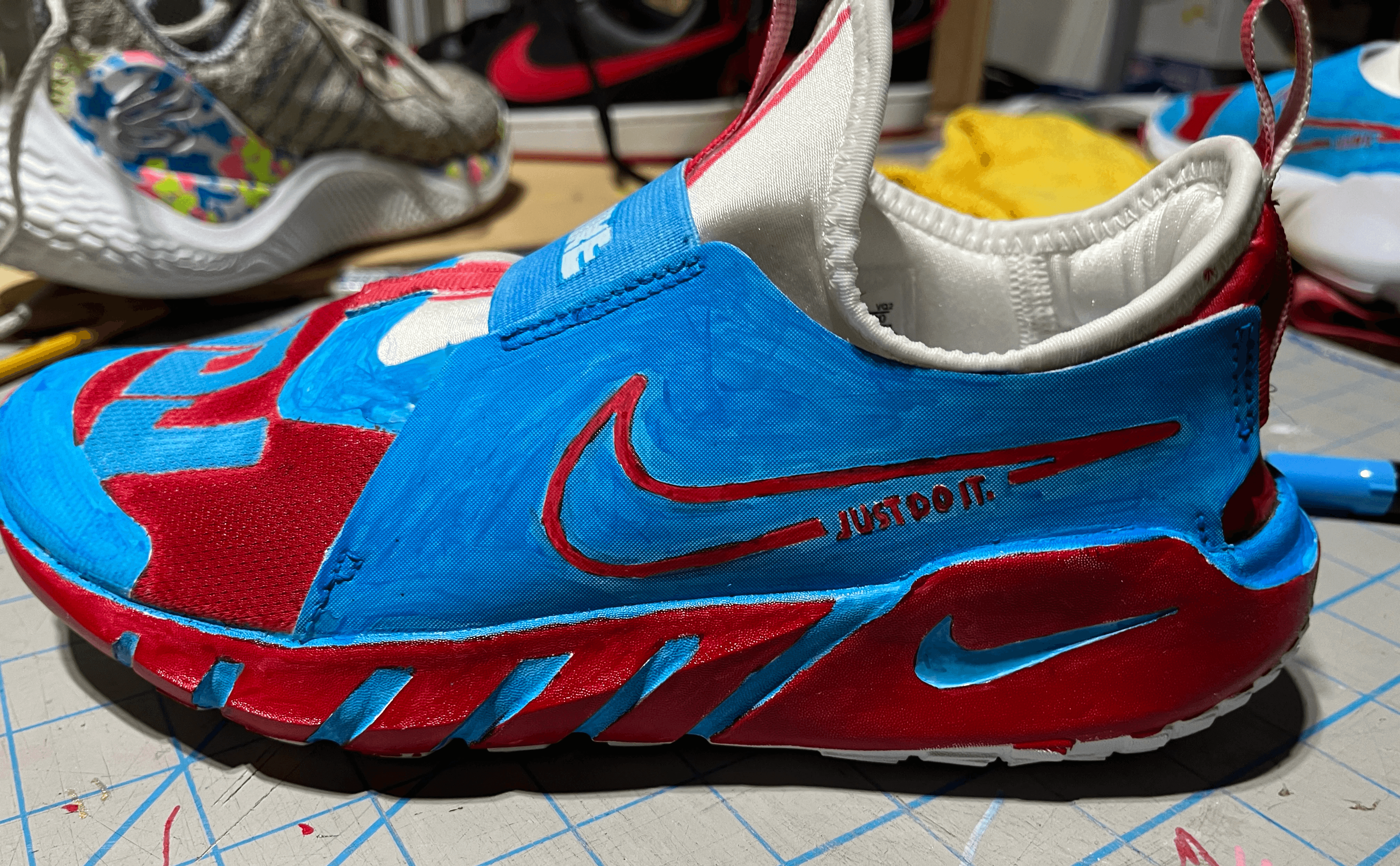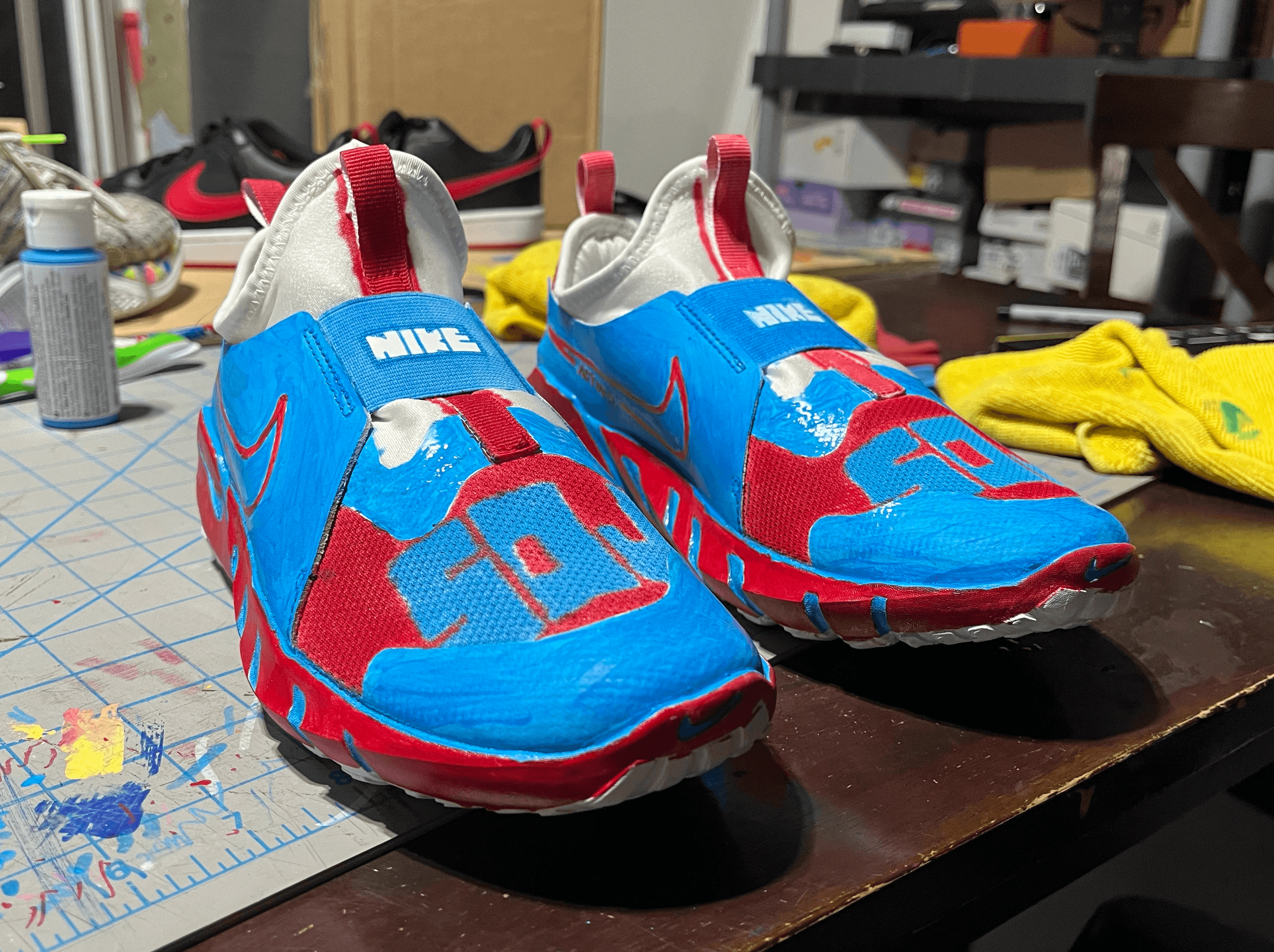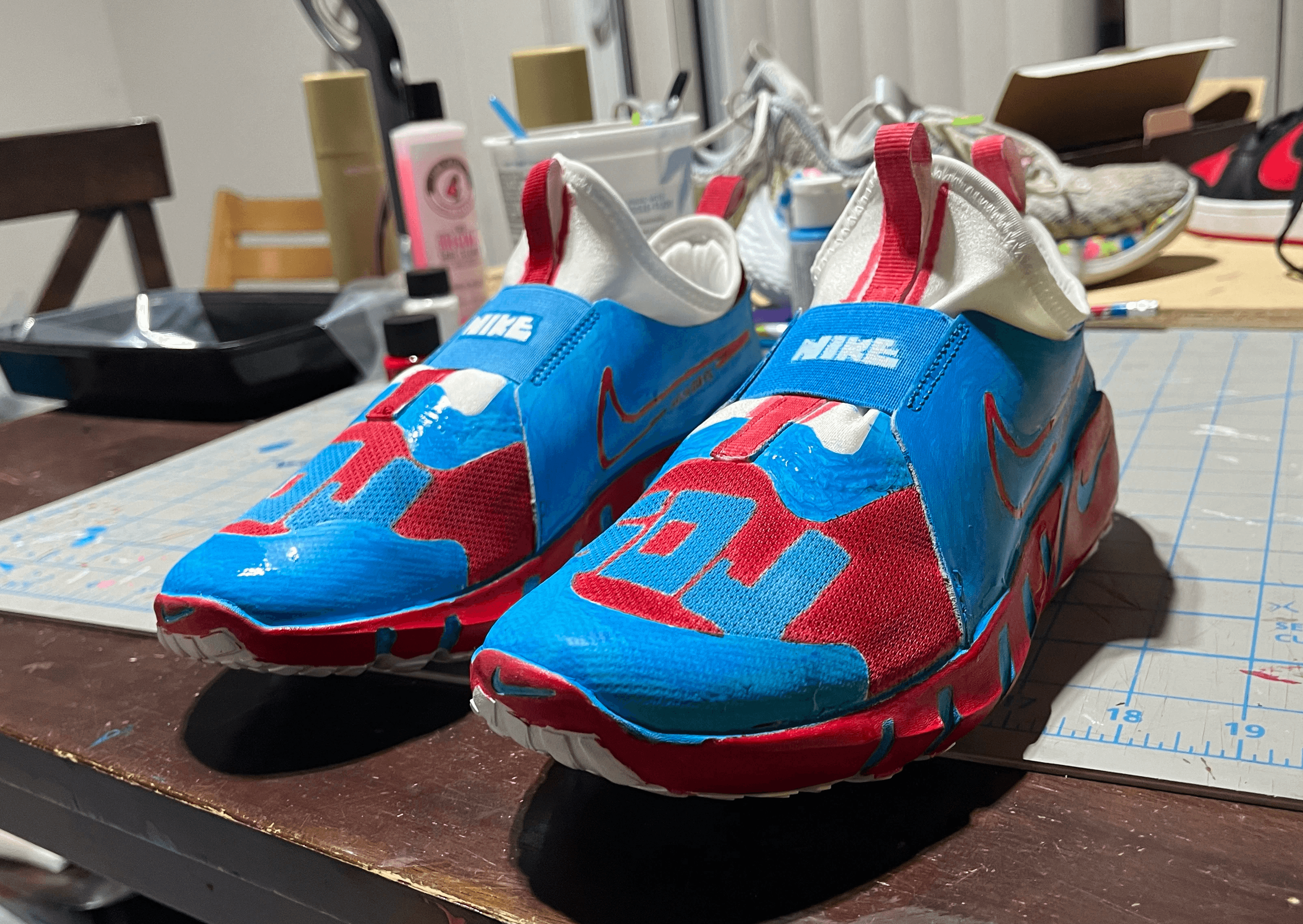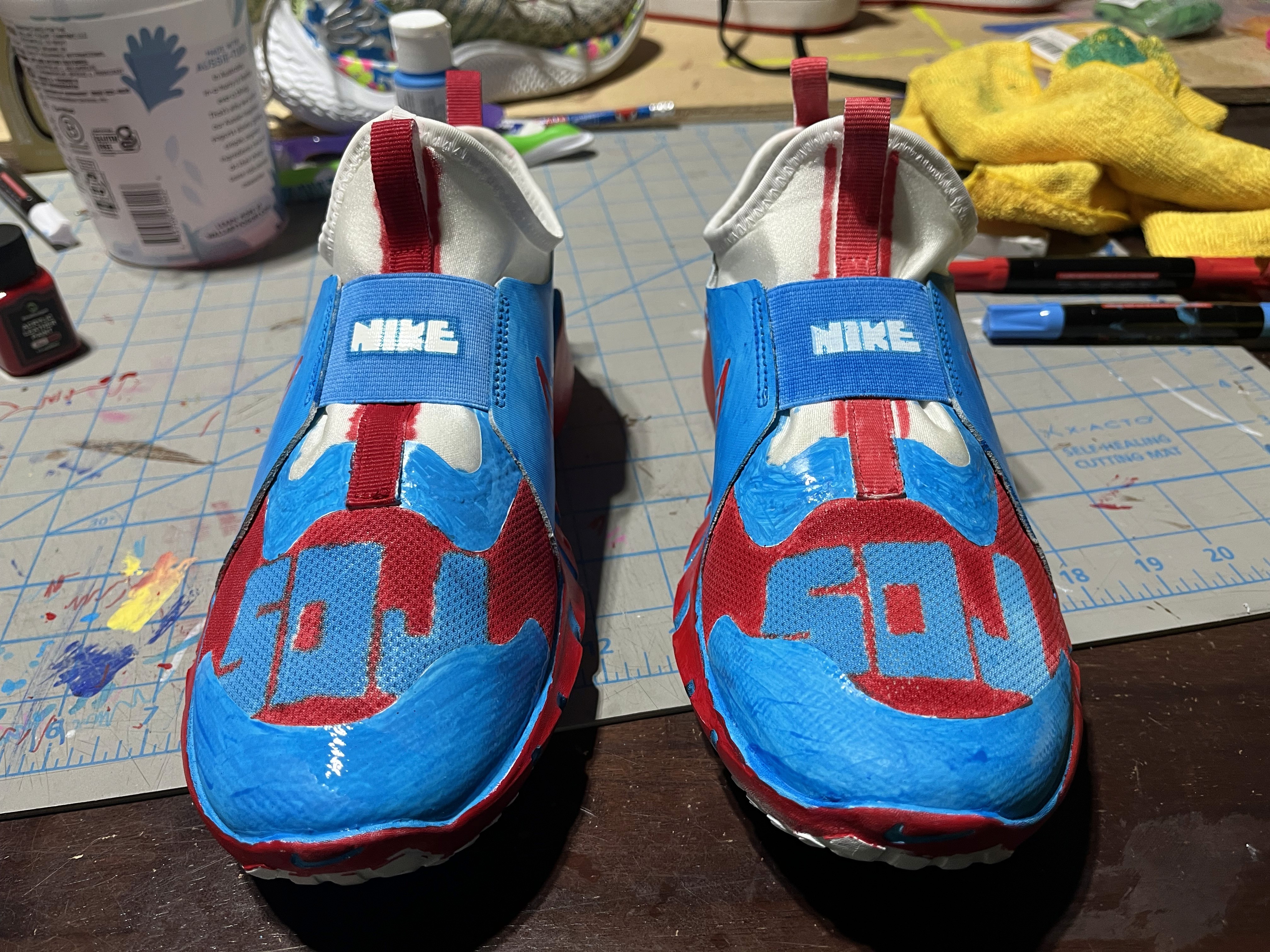 These custom Nike shoes feature a striking hand-painted design with bold blue and red color blocking, accented by large “S-O-J”initials across the toe box. The vibrant palette and unique detailing make them stand out as a personalized statement piece in any sneaker collection.